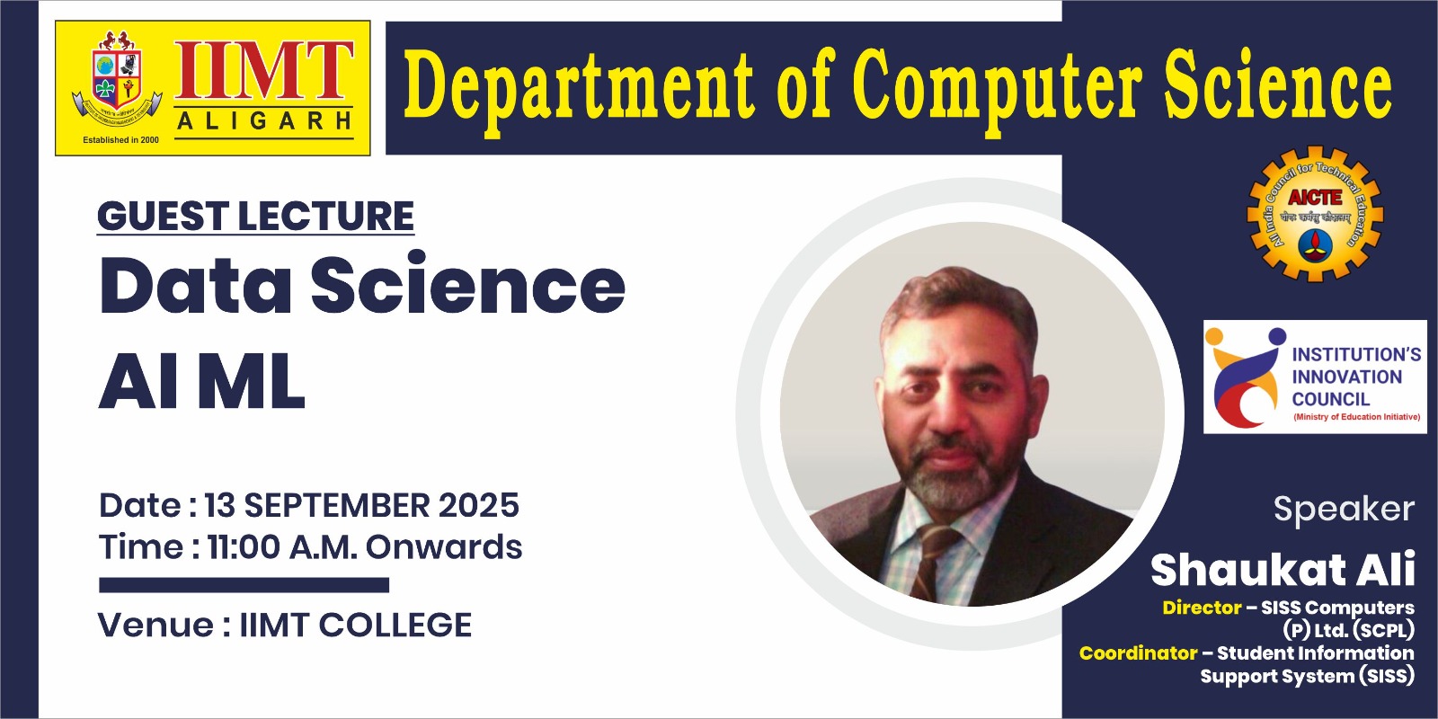 The guest lecture on “Data Science, Machine Learning, and AI” by Dr. Shaukat Ali , Director – SISS Computers (P) Ltd. (SCPL) , Coordinator – Student Information Support System was held on 13th September 2025 (Saturday) at 10:50 a.m. at IIMT COLLEGE ALIGARH.