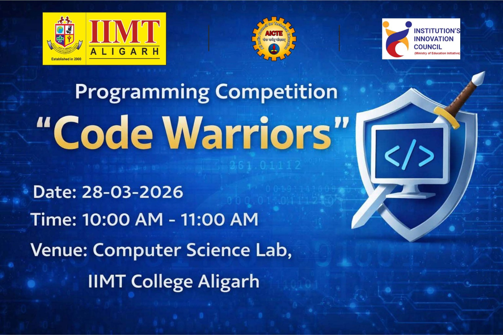 The Computer Science Department, IIMT Aligarh, successfully hosted the “Code Warriors” programming competition on 28-03-2026. The event saw enthusiastic participation from Computer Science students.